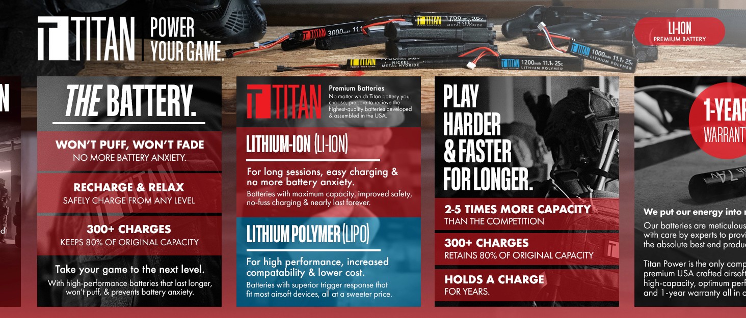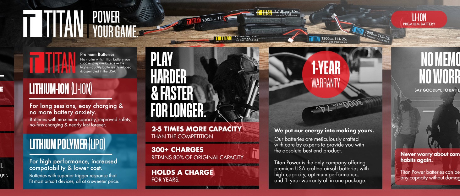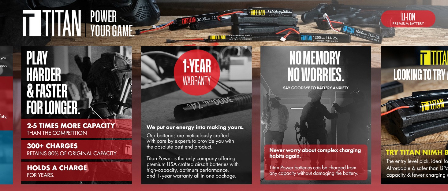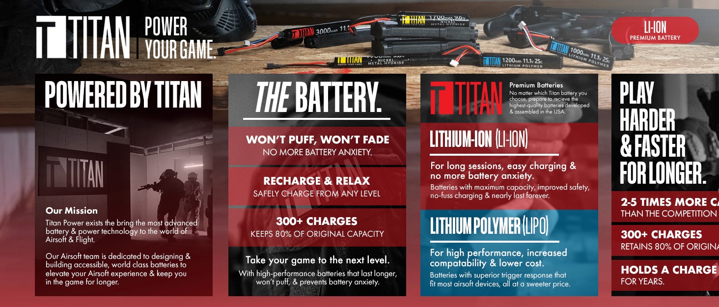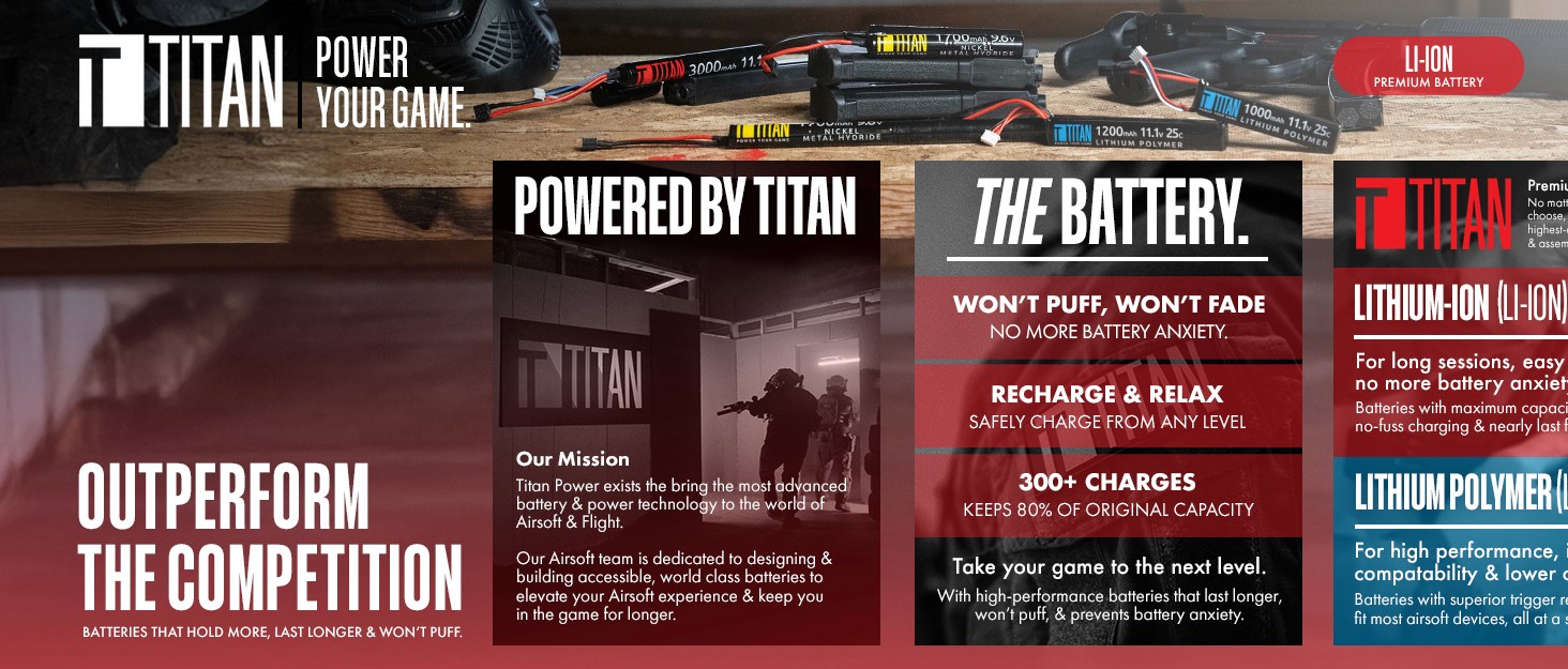 Titan is seen as a top-of-the line battery in the airsoft market. With airsoft being an enthusiast-centric sport, we needed to make sure we adjust our presentation to fit.